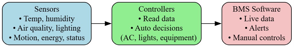 First, sensors are installed throughout the building. These sensors measure things like temperature, humidity, air quality, lighting levels, motion, energy consumption, and equipment status. They continuously send this information to the BMS. For example, a temperature sensor in a room tells the system whether the room is too hot or too cold.