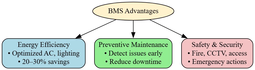 A major advantage of a BMS is energy efficiency. It ensures that air-conditioning, heating, and lighting operate only when needed and at the right level. In large buildings, this can reduce energy consumption by 20–30%. Over time, this results in significant cost savings. The system also improves comfort for building occupants by maintaining stable temperature, ventilation, and lighting conditions.
