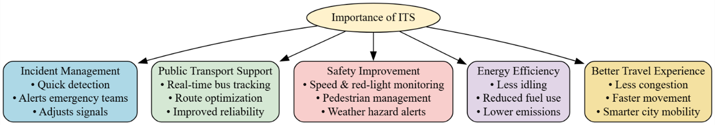 A major advantage of ITS is improved safety. By monitoring speed violations, detecting red-light running, and managing pedestrian crossings, the system reduces the chance of accidents. Similarly, weather sensors can warn drivers about slippery roads or low visibility.