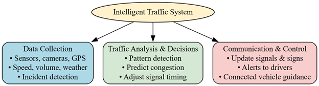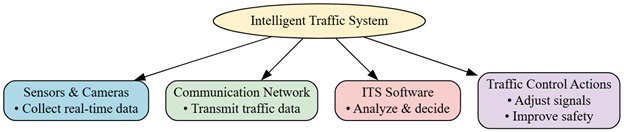 An Intelligent Traffic System (ITS) is a modern, technology-driven approach to managing road transportation. Its main purpose is to reduce traffic congestion, improve road safety, and make transportation more efficient for both commuters and managers. Instead of relying only on human traffic police or manual signals, an ITS uses sensors, cameras, communication networks, and software to monitor traffic conditions in real time and make smart decisions automatically.