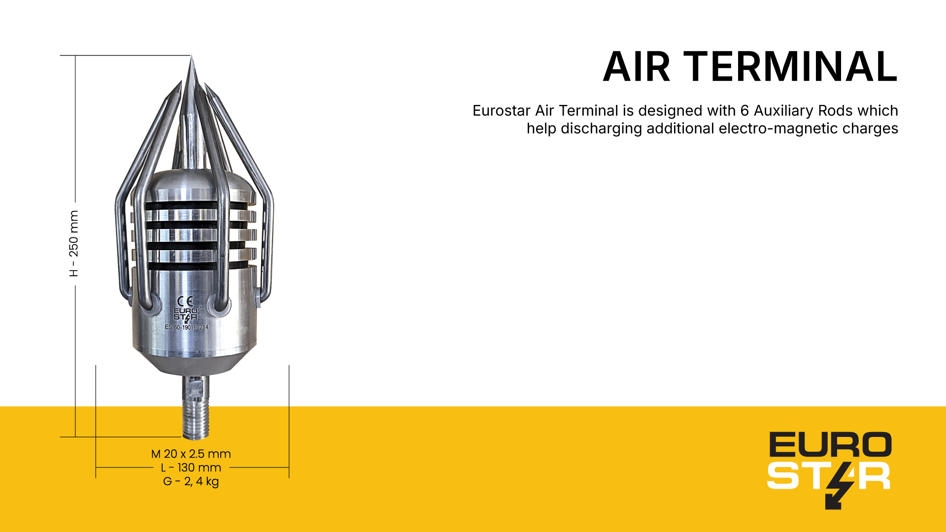 At the heart of this system is the Eurostar Air Terminal, which features Early Streamer Emission (ESE) technology. Unlike traditional lightning rods, ESE technology captures lightning strikes earlier, offering more effective protection. The system includes 6 auxiliary rods, which discharge additional electromagnetic charges, allowing for a longer and more powerful upward streamer. This air terminal protects structures up to 214 meters in radius, ensuring extensive coverage.