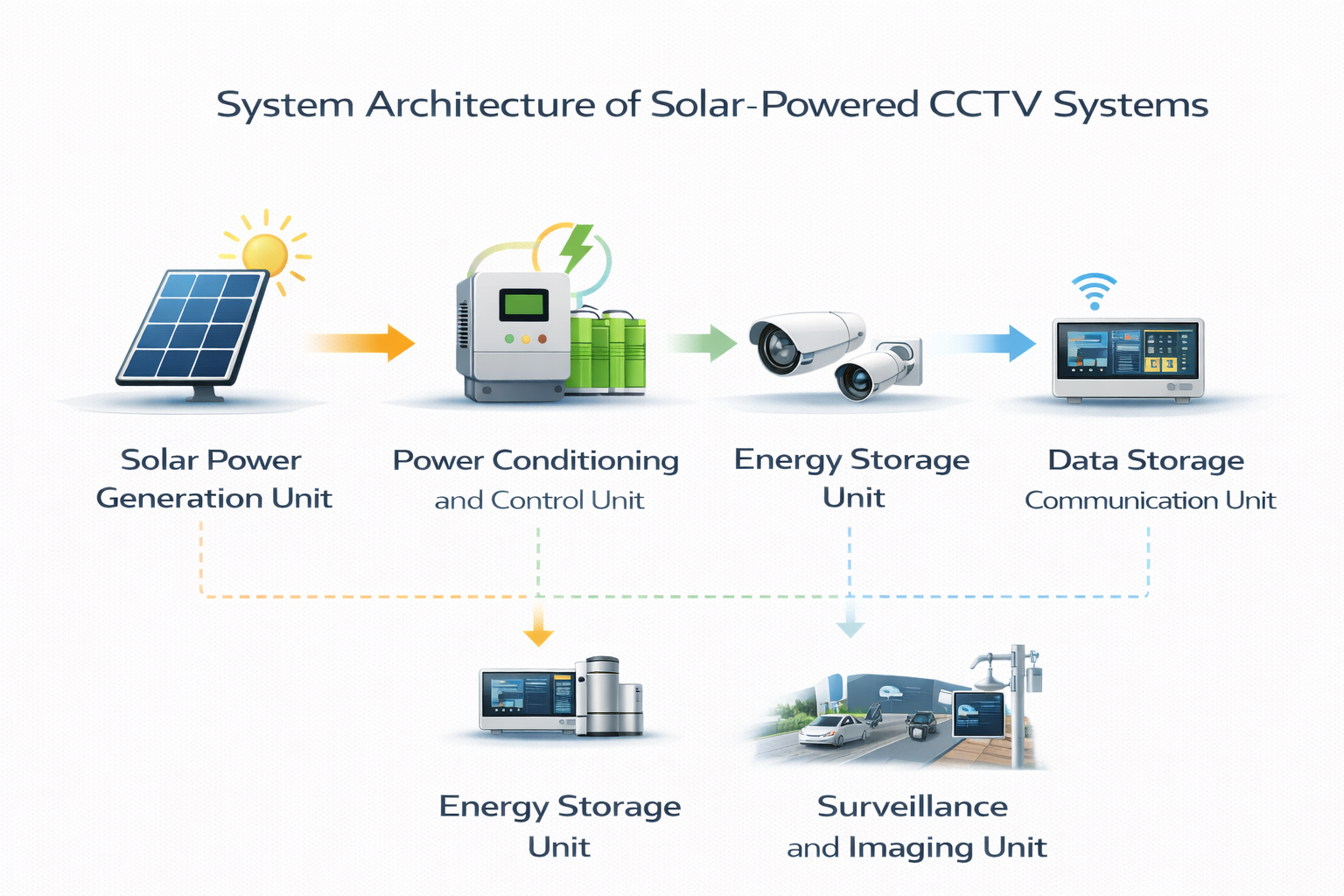 A solar-powered CCTV system consists of several interconnected subsystems that work together to provide reliable surveillance: