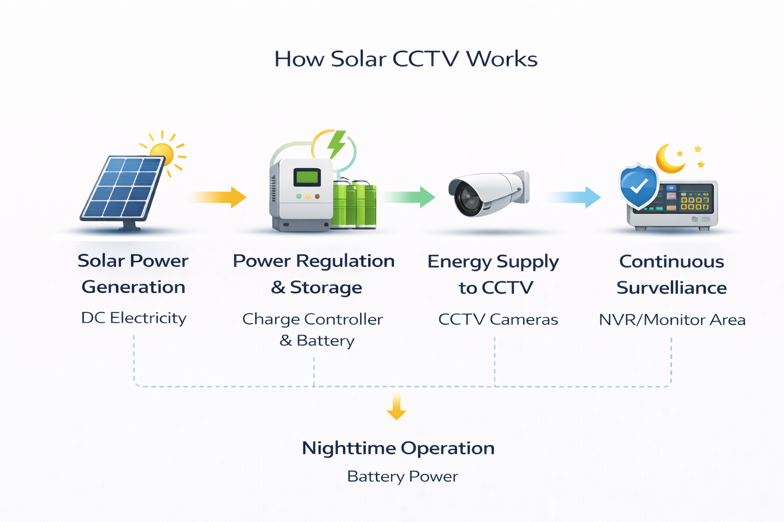 A solar-powered CCTV system is a standalone surveillance solution that uses solar photovoltaic (PV) panels to generate electrical power. The generated energy is stored in batteries, which are then used to power the CCTV cameras, recording units, and communication modules.