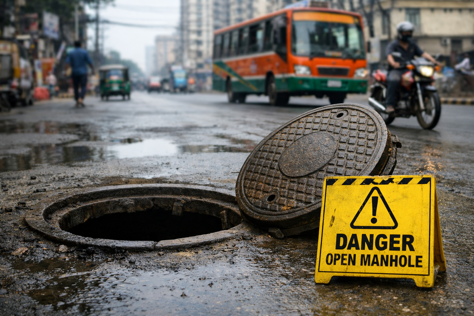 In many parts of Bangladesh, missing or uncovered manholes have become a significant threat to public safety. Roads across Dhaka, Gazipur, and other cities often contain open manholes without proper warning signs, particularly after heavy rain or waterlogging.